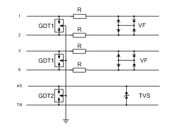 采用两级防护电路,第一级采用大通流容量的高性能GDT将大部分雷击能量泄放入地,第二级采用快速响应TVS进一步钳制过电压幅值。